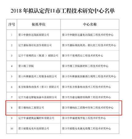 2018年11月9日,營口市科學(xué)技術(shù)局公布了關(guān)于擬認(rèn)定2018年?duì)I口市工程技術(shù)研究中心的公示,依托營口德瑞化工有限公司申報(bào)的“營口市德瑞化工藥物中間體工程技術(shù)研究中心”被列入2018年度市級(jí)組建計(jì)劃中。